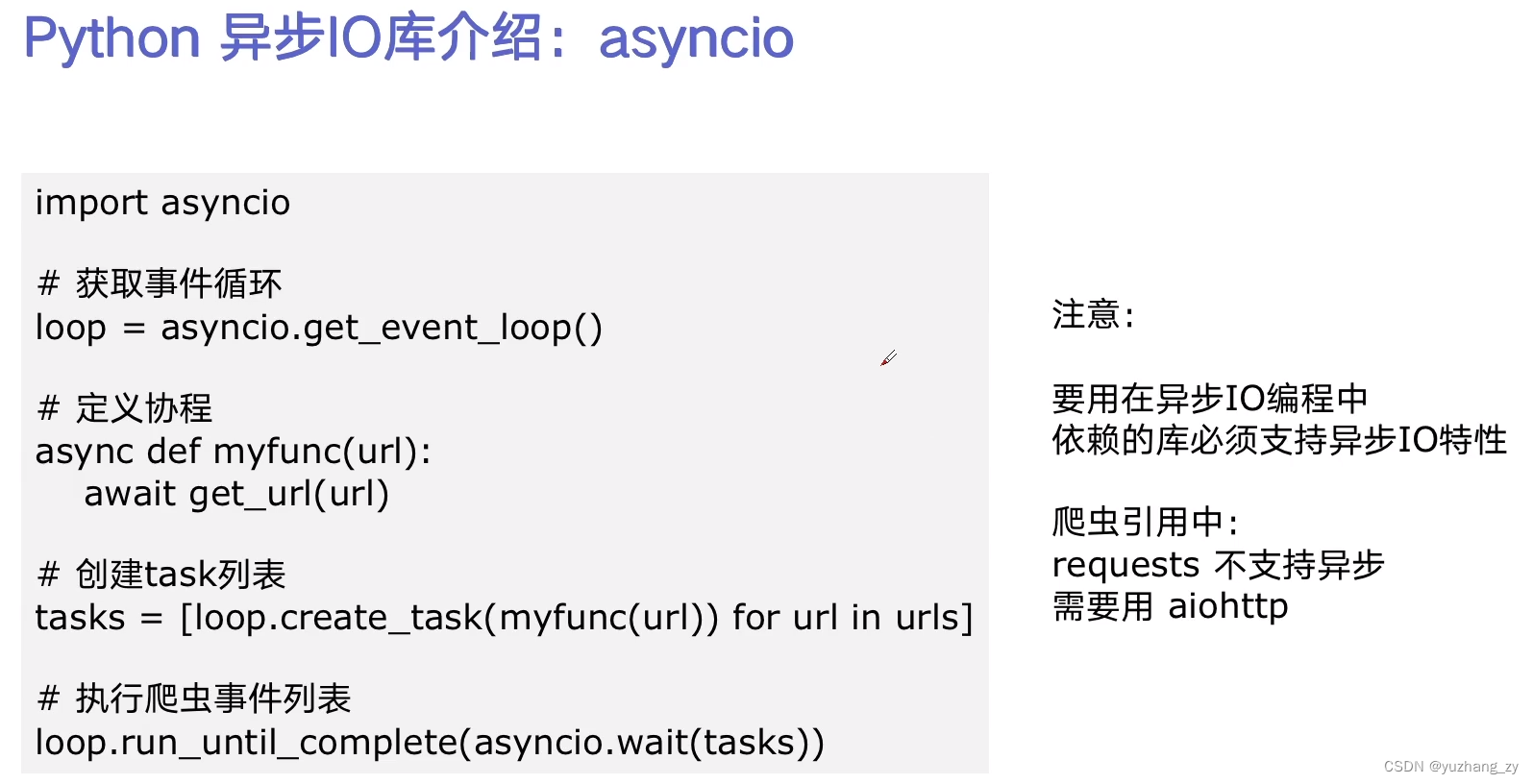 并不是所有的库都支持异步爬虫,例如requests 库就不支持异步IO特性:
