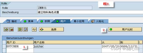 接下来,使用 SU01 建立一个用户假设名叫 butcher ,然后在此将角色 ZMM01 分配给它,如图 3 ,记得要做“ 用户比较 “知道该按纽变绿,这和人带的帽子不同,在角色设置中,越绿越好,至此,一个最简单的权限设置就 Ok 了,用户 butcher 只能使用 MM01 在工厂 FRA1 , FRA1 , FRM1 , FRM2 四个工厂上建立物料主数据。