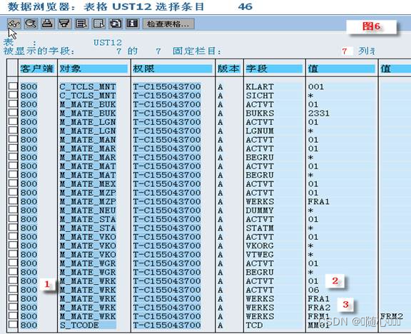 图 4-[2][5] :用户授权对象表 USRBF2 包含了 ERP 用户 BUTCHER 所对应的(授权)对象和对象对应的权限名称,现在注意一下 USRBF2 表用户 BUTCHER 包含了工厂的授权对象 M_MATE_WRK , 其对应的授权名称是 T-C155043700 , 那么 图 2-[7] 设置的四个工厂 FRA1 , FRA1 , FRM1 , FRM2 保存在什么地方呢?请见 图 6 。