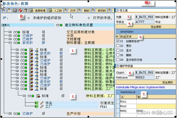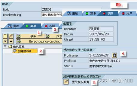图 1-[1][2] :在菜单 Tab 页选择“ 事务 “加入 MM01-> 创建物料 & , 你还可为程序 , 查询这样的报表授权,选择” 其它 “还能为数据仓库等对象设置权限角色。