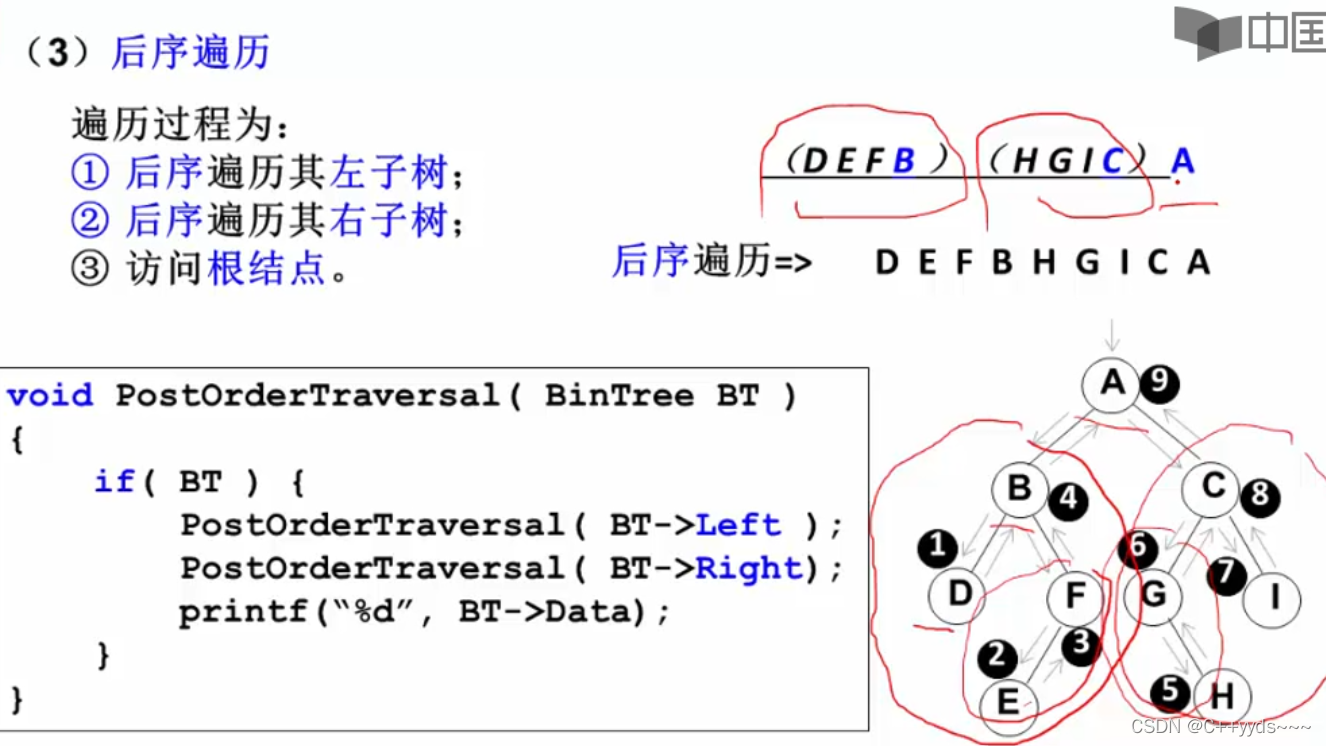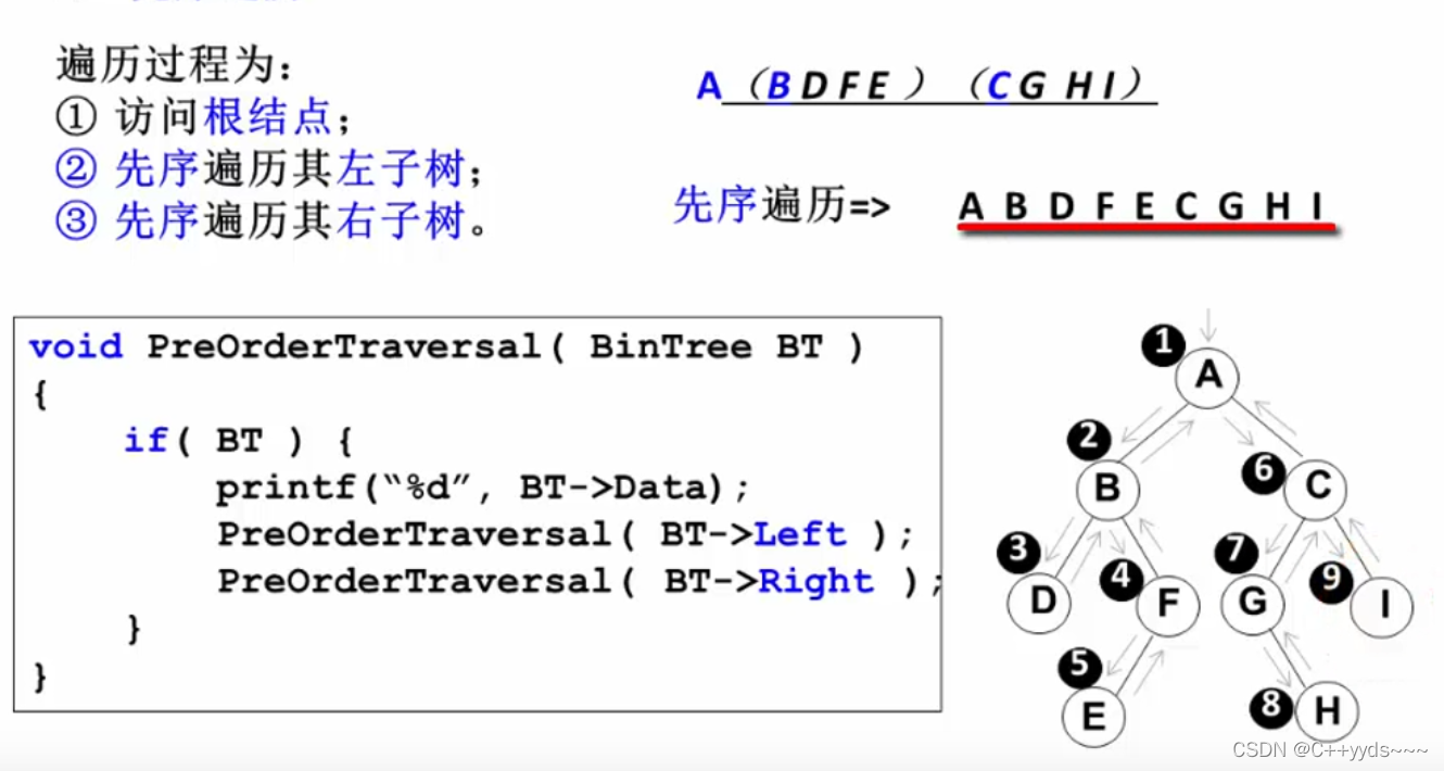 //二叉树结点 typedef struct BINARYNODE { char ch; struct BINARYNODE* lchild; struct BINARYNODE* rchild; }BinaryNode; //递归遍历 void Recursion(BinaryNode*root) { if (root == NULL) { return; } //先序遍历 //先访问根节点 printf("%c", root->ch); //再遍历左子树 Recursion(root->lchild); //再遍历右字数 Recursion(root->rchild); ////中序遍历 ////先遍历左子树 //Recursion(root->lchild); ////再访问根节点 //printf("%c", root->ch); ////再遍历右字数 //Recursion(root->rchild); //Recursion(root->lchild);//左 //Recursion(root->rchild);//右 //printf("%c", root->ch);//根 }