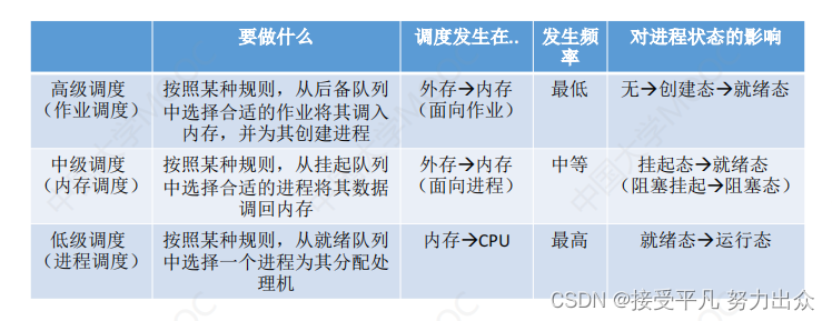 2.作业调度次数少,中级调度次数略多,进程调度频率最高。