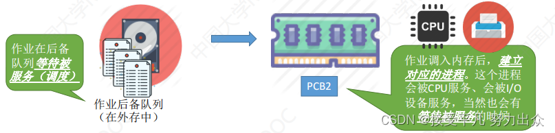 高级调度(作业调度)。按照一定的原则从外存的作业后备队列中挑选一个作业调入内存,并创建进程。每个作业只调入一次,调出一次。作业调入时会建立PCB,调出时才撤销PCB。