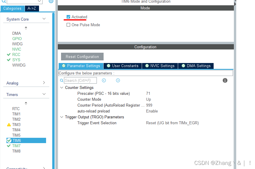 TIM6配置为连续定时模式,1ms中断一次