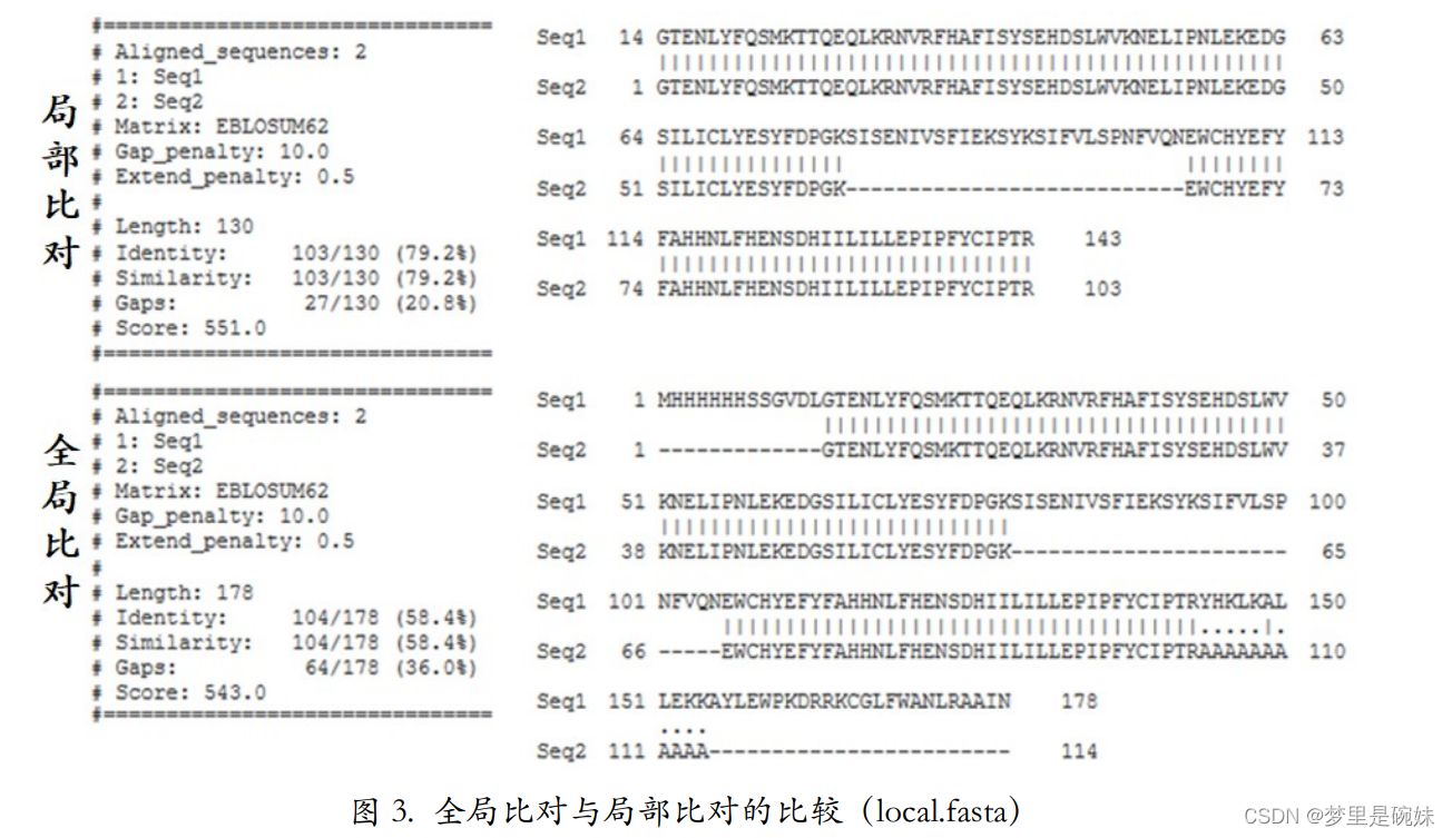 有时候两条序列并不同源,它们只是有一个功能相似的区域, 这时用局部比对我们就能很快找到这一区域在两条序列中的位置。但是如果做全局比对的话, 结果就不如局部比对明显了。