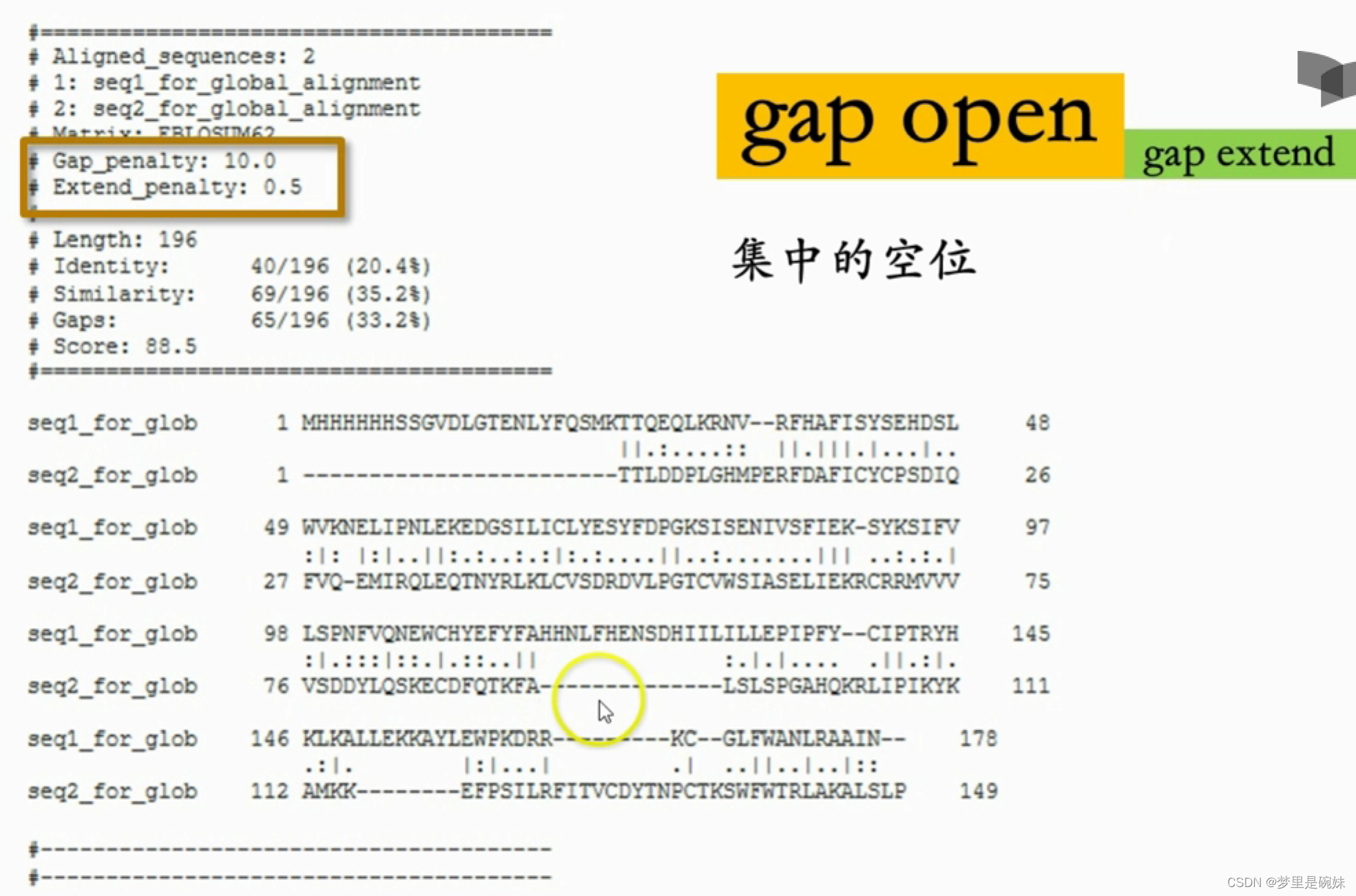 当 gap 开头罚分大,gap 延长罚分小的时候,说明在连 续的字母里插入一个 gap 打开一个缺口要付出很大的代价,因为 gap 开头罚分大。gap 都集中连成长串出现。