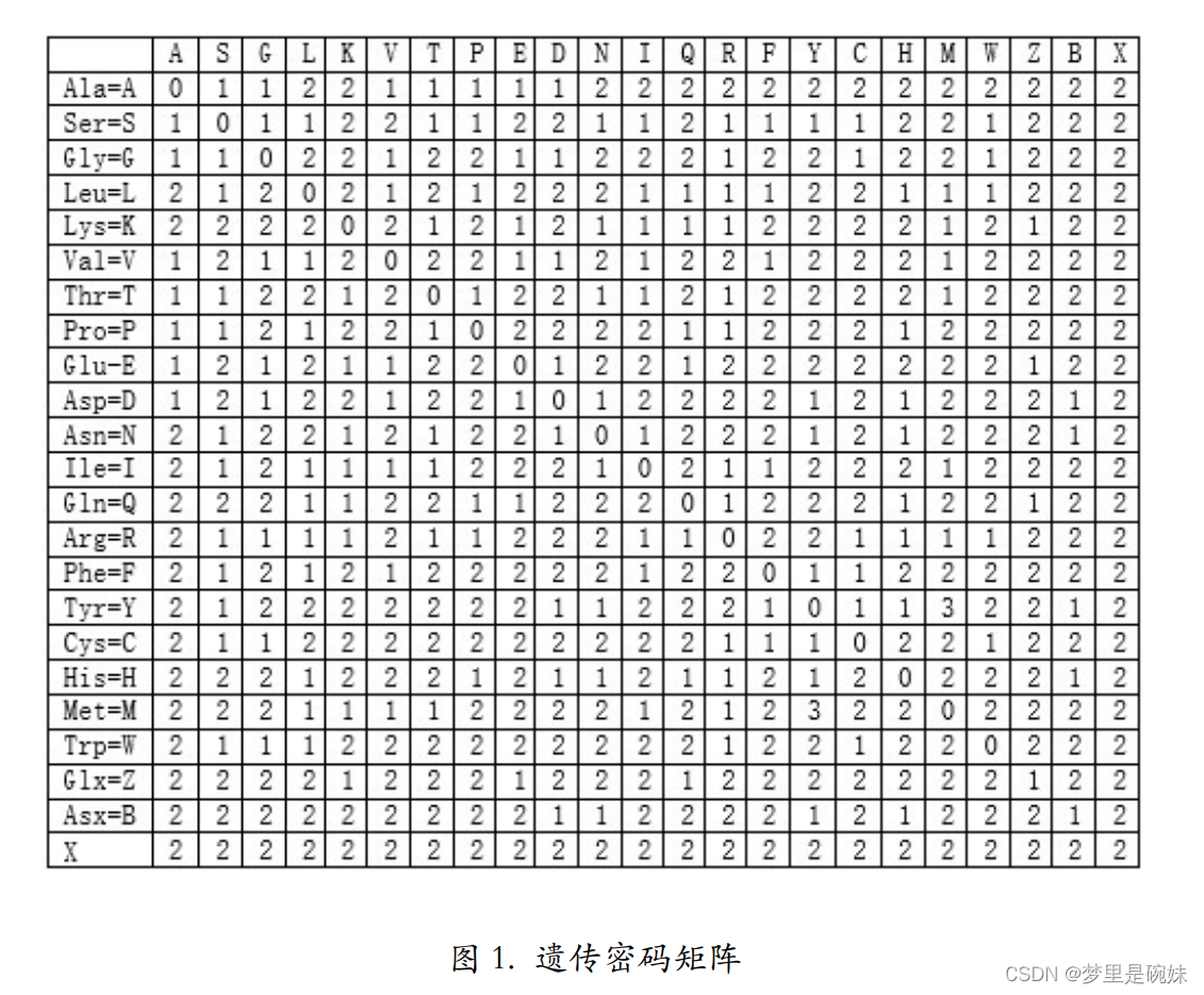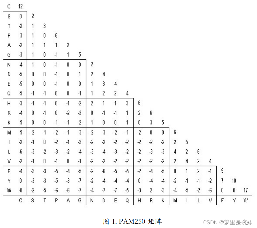 它是通过计算一个氨基酸转换成另一个氨基酸所需的密码子变化的数目而得到的。 矩阵的值对应为据此付出的代价。