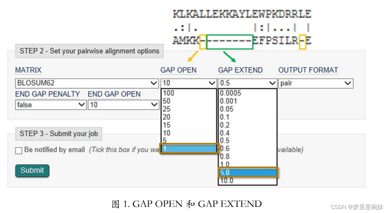 EMBL 比对工具将 gap 分为两种,一种叫“gap 开头(GAP OPEN)”,另一种叫“gap 延长(GAP EXTEND)”。gap 开头就是连续的一串 gap 里面打头的那一个,可以当 它是队长。gap 延长就是剩下的那些 gap,也就是队长后面跟着的小兵。