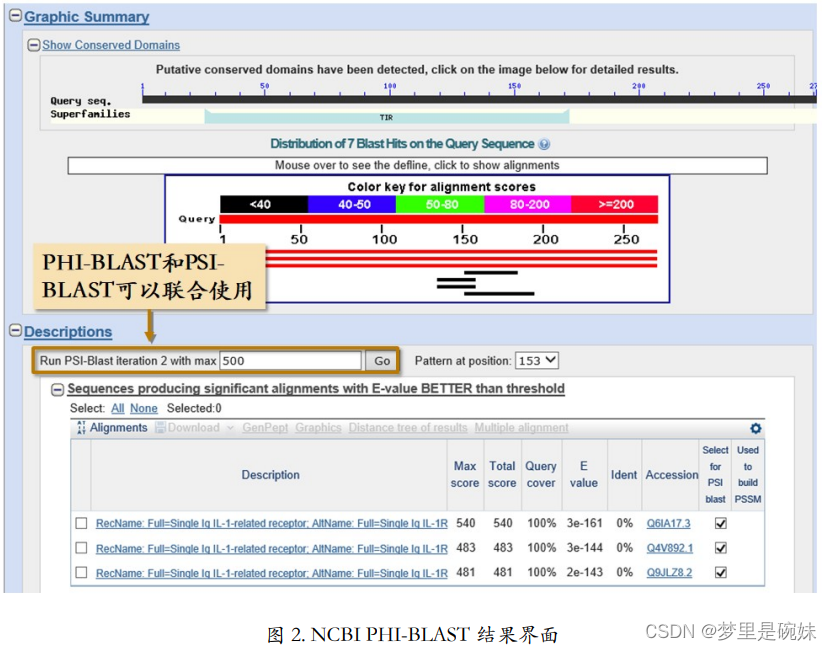 PHI-BLAST (Pattern-Hit Initiated )和 PSI-BLAST 不同,PSI-BLAST 是撒大网搜索,而 PHI-BLAST 则是精准搜索。PHI-BLAST 能找到与输入序 列相似的并符合某种特征模式的蛋白质序列。
