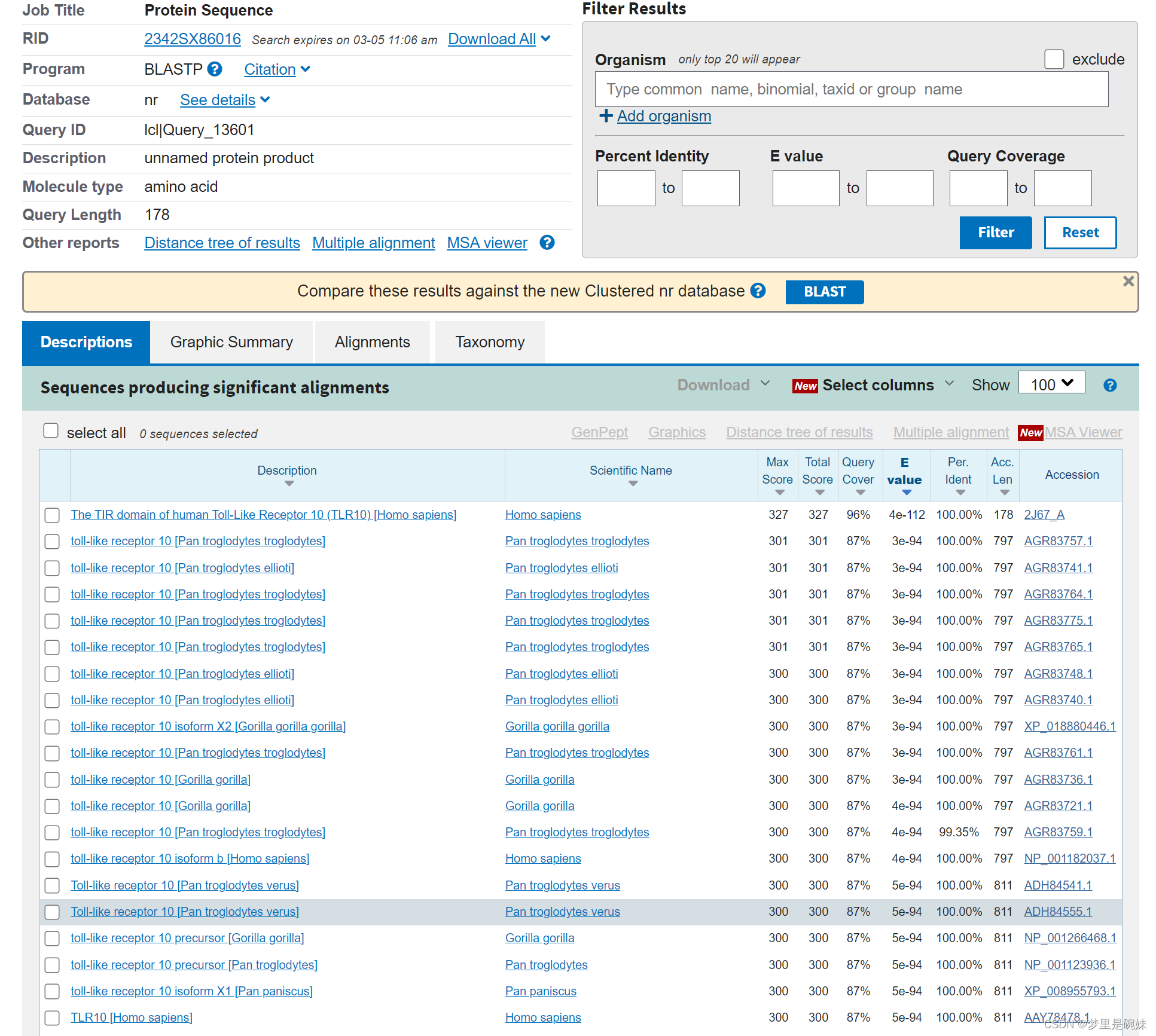 如果想要快速找到本轮搜索新找到的序列,也就是第一条标黄的序列,可以点击结果页 面上方“skip to the first new sequence”链接。