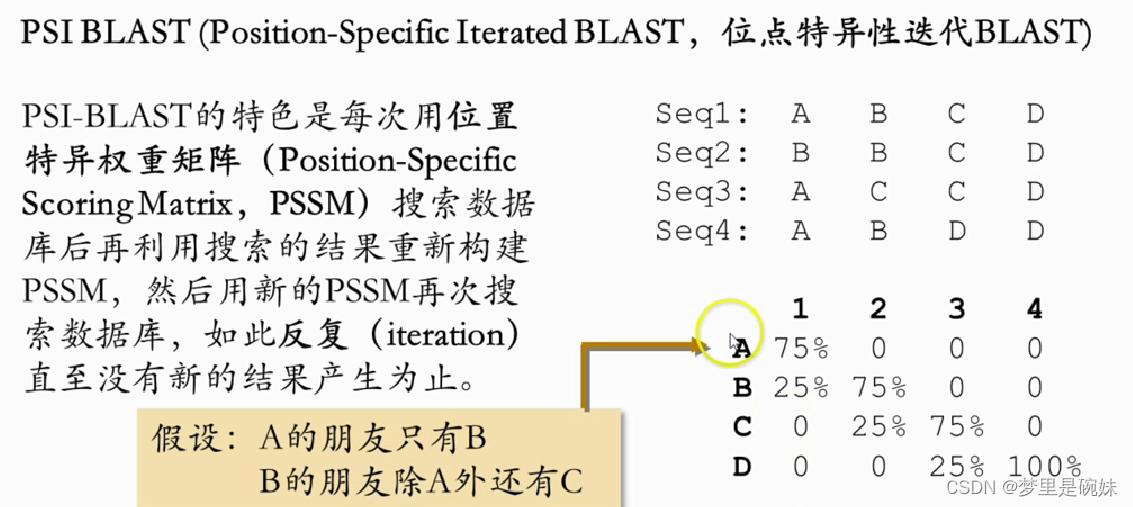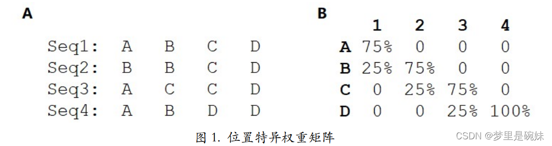 位置特异权重矩阵(Position-Specific Scoring Matrix,简称 PSSM)是 以矩阵的形式,统计一个多序列比对中,每个位置上不同残基出现的百分比。假设 A 的朋 友只有 B,B 朋友除 A 外还有 C。如果输入序列的第一个位置是 A,那么在第一轮没有 PSSM 辅助的情况下,只有第一个位置是 A 或 B 的序列被找到了。它们是图 1-A 中所示的四条序 列。根据这四条序列创建的 PSSM(图 1-B)得知,第一个位置可以是 A,也可以是 B,那么 在第二轮搜索中,除了 A 的朋友 B 之外,B 的朋友 C 也可以出现在第一个位置了。这样如 此反复,我们就可以找到朋友的朋友了。