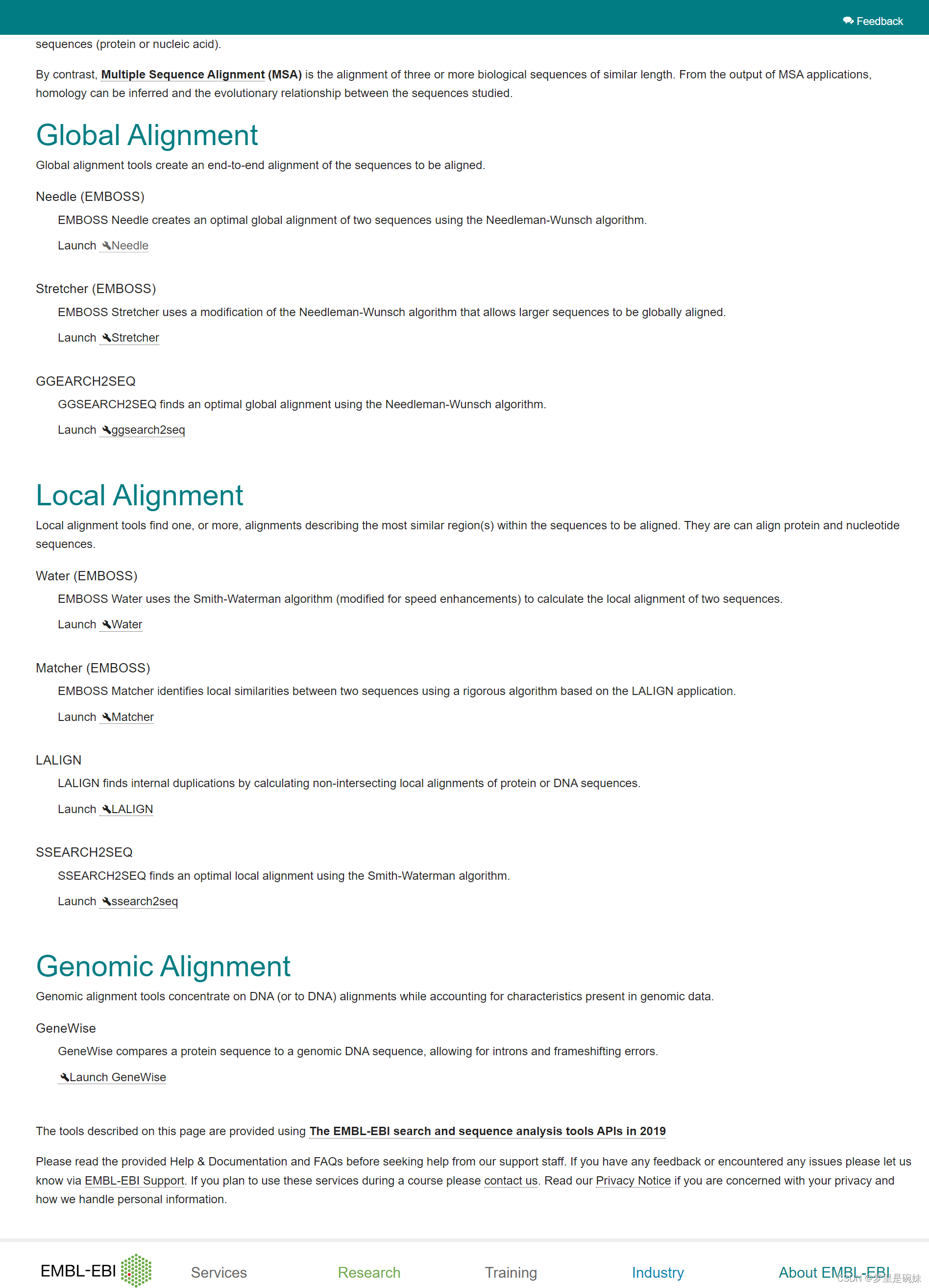 页面上有有全局比对工具(Global Alignment)、 局部比对工具(Local Alignment)、还有基因组比对工具(Genomic Alignment)。