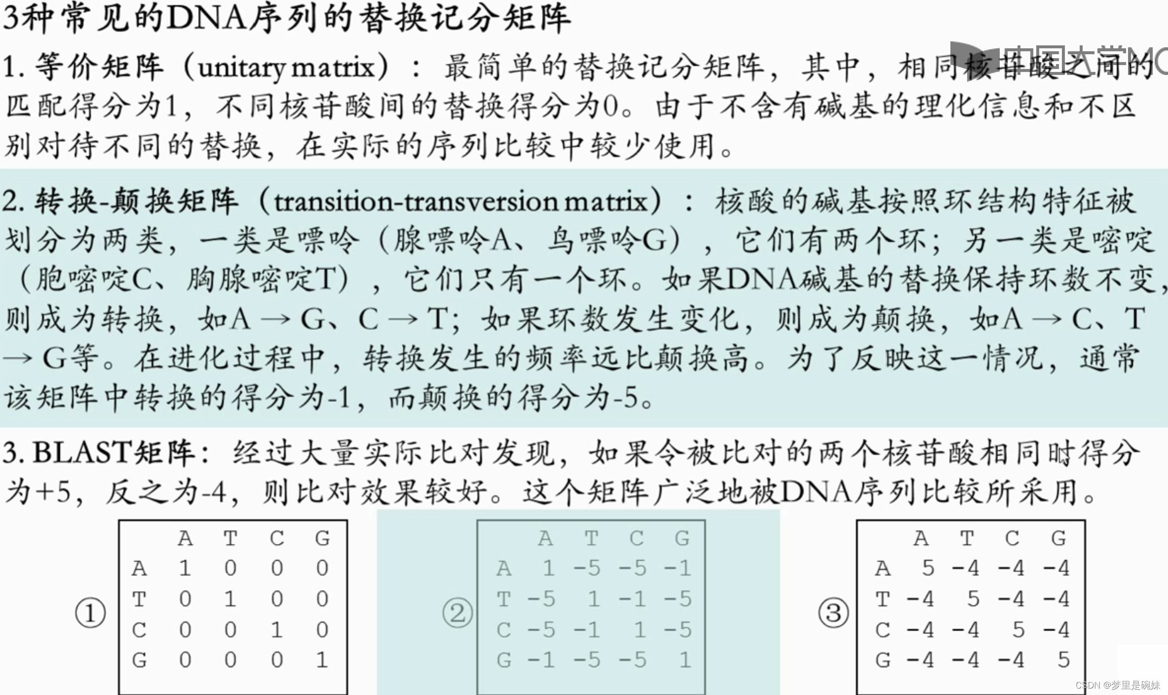 (1)等价矩阵:直接定义相同核苷酸之间的匹配得分为 1,不同核苷酸间的替换得分为 0。在实际的序列比较中很少使用,一般只用于理论计算。