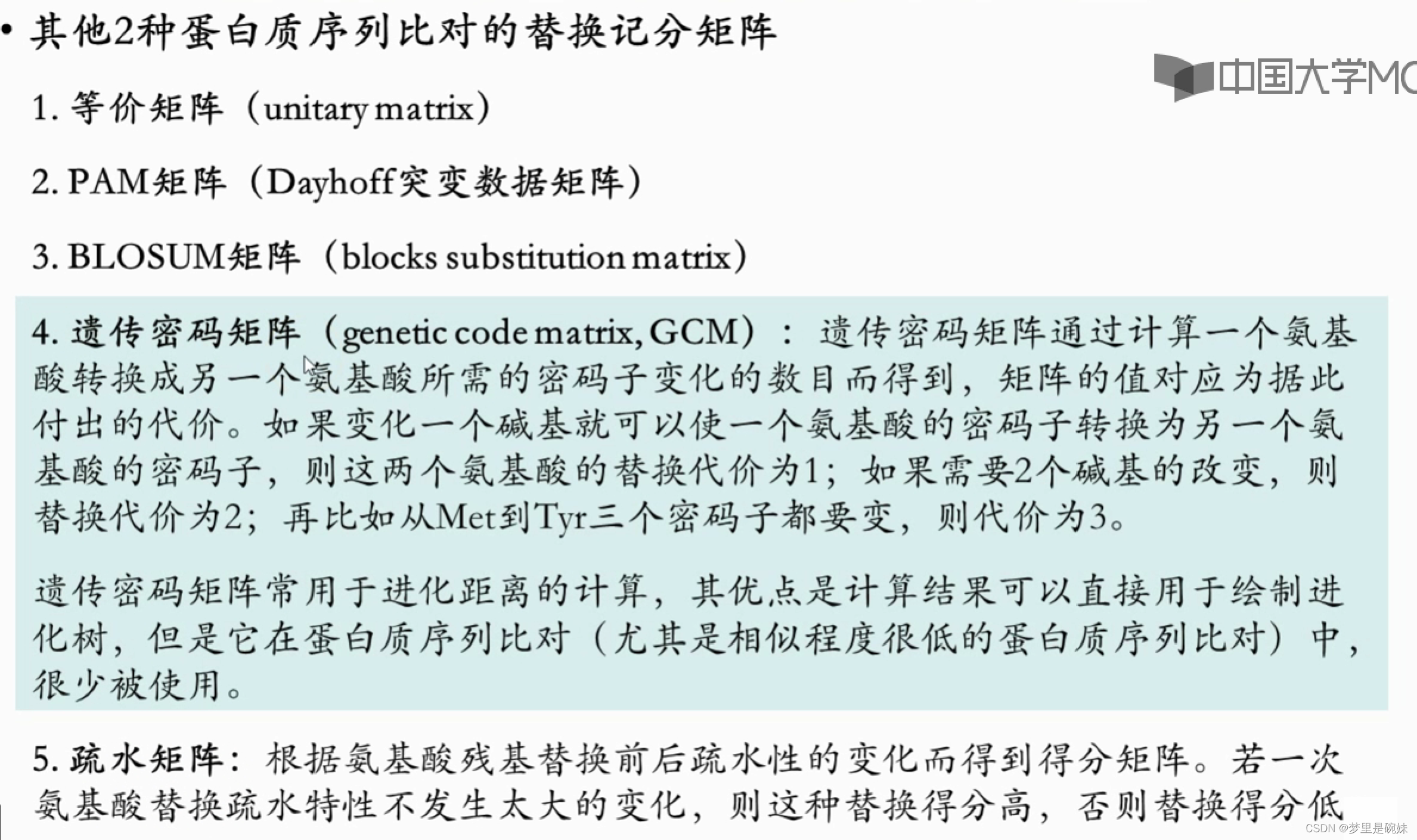 蛋白质最矩阵有五种: 等价矩阵、PAM 矩阵、 BLOSUM 矩阵、遗传密码矩阵、疏水矩阵。