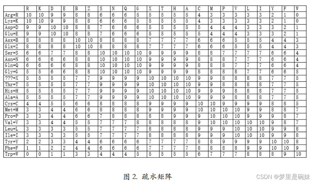 它是根据氨基酸残基替换前后疏水性的变化而得到的矩阵。 若一次氨基酸替换导致疏水特性不发生太大的变化,则这种替换得分高,否则替换得分低。