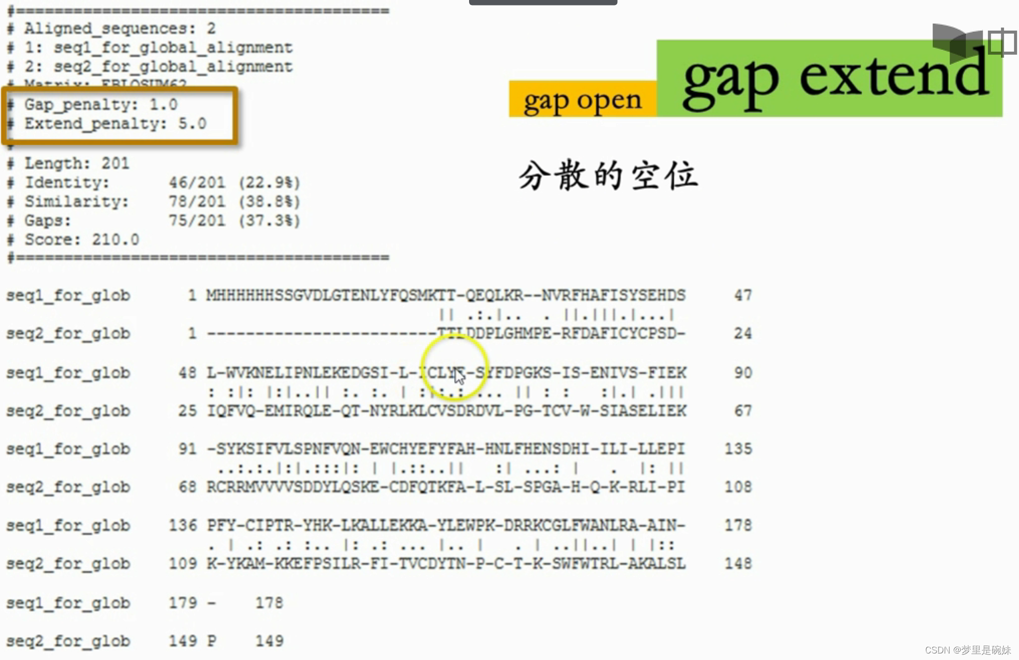这一串里,第一个 gap 是 gap 开头,后面的都是 gap 延长。单独的一个 gap 按 gap 开头算。gap 开头和 gap 延长 可以分别定义不同的罚分。默认情况下,gap 开头罚分多,gap 延长罚分少。