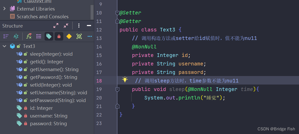 位置:类上方或属性上方,在属性(即成员变量)上方则为属性(即成员变量)生成setter/getter方法,在类上方表示给该类下的所有属性生成setter/getter方法。