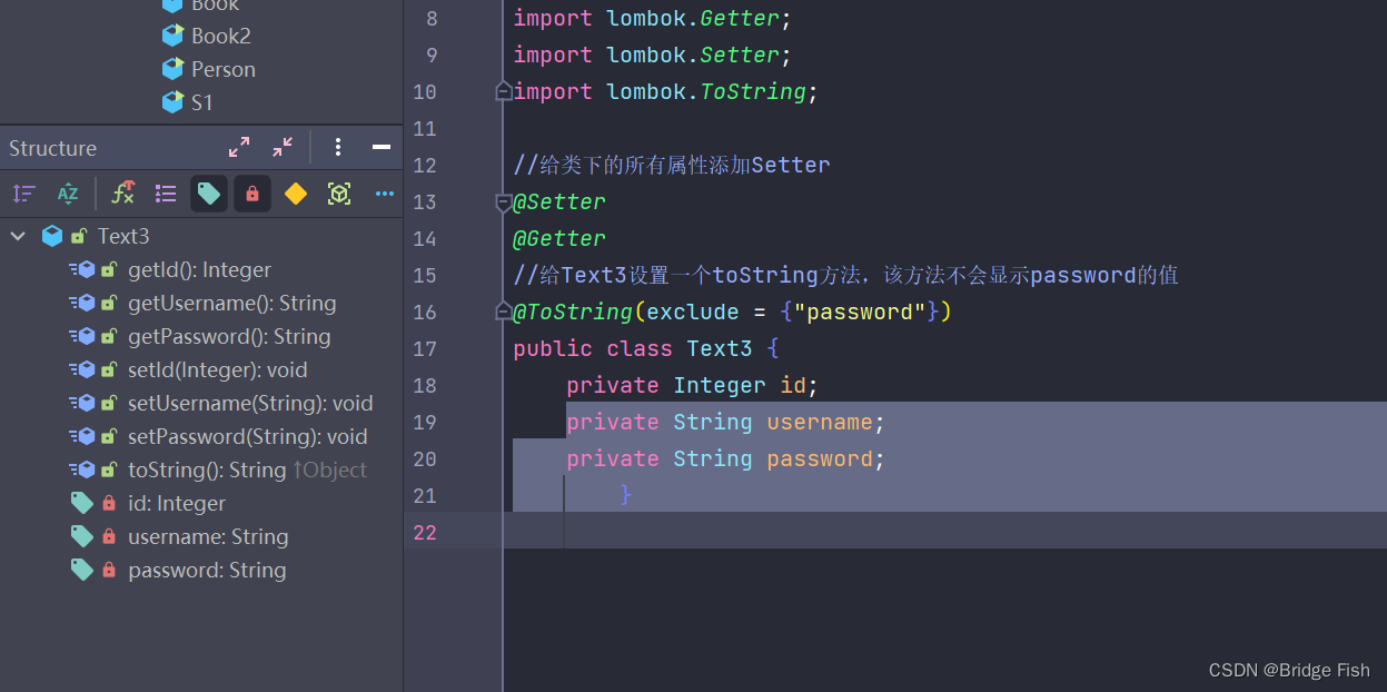 如果只是在类上方写一个@ToString,那么toString方法是输出所有的成员变量,另外如果用exclude属性的话,要想不输出多个成员变量的话,就像列表那样写