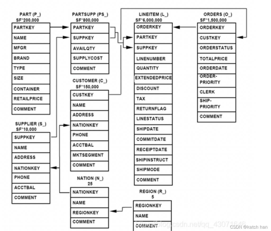 TPCH基准模型中定义了一个数据库模型,容量可以在1GB~10000GB的8个级别中进行选择。数据库模型包括CUSTOMER、LINEITEM、NATION、ORDERS、PART、PARTSUPP、REGION和SUPPLIER 共8张数据表,以及22条SQL查询语句,可以较完整地测试数据库的运算性能。