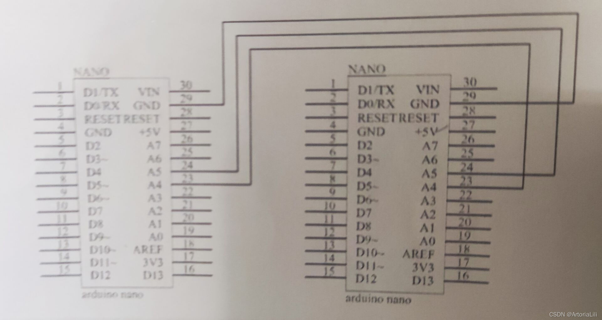 而这个就是我们的接线图,现在我们只要在主机和从机上的D13管脚都接上我们的led灯就可以了