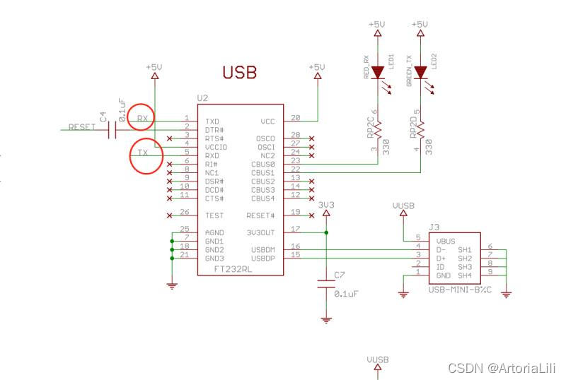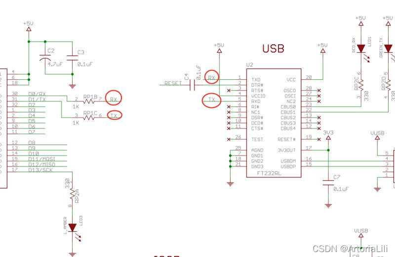 在物理上,串口通信需要三根线 TX RX GND,TX是发送,RX是接受 GND是接地,看看原理图