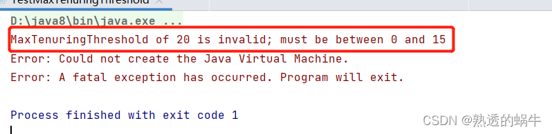 MaxTenuringThreshold该参数取值0-15,由于对象头中只有4个二进制位来存储分代年龄,所以该值最大只能是15,超过该范围报错。