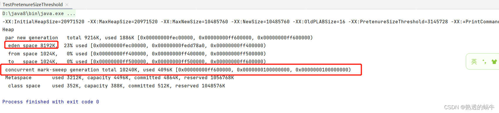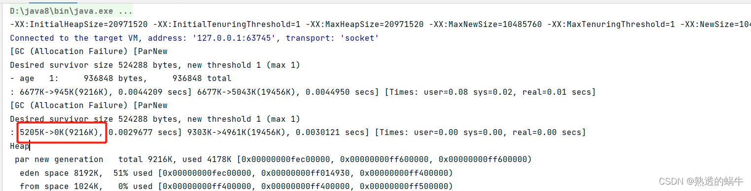 从上图可以看出,4MB的对象直接分配到了老年代中,占用了4096KB,没有在新生代进行分配。