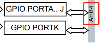 然后,我们就要打开芯片的数据手册,找到我们的GPIOB的时钟挂在哪一条总线上。由下图可看出,GPIOA~GPIOK都挂在AHB4总线上。