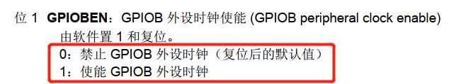 我们已经了解位操作,也会查找寄存器的地址后,看到寄存器的位说明,在这一位置位,即可使能GPIOB的时钟。