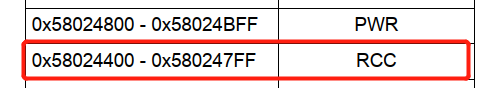 例如,我们想要打开GPIOB的时钟,我们就要找到RCC的这一栏。由下图可看出,只要是和RCC相关的,都在0x58024400-0x580247FF这一区间。