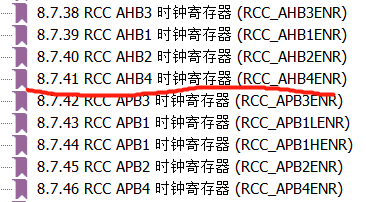 我们再回到参考手册的RCC寄存器说明,可以看到好几个和AHB4相关的寄存器。我们只需要看到RCC_AHB4ENR,实际上这里应该叫做时钟使能寄存器。