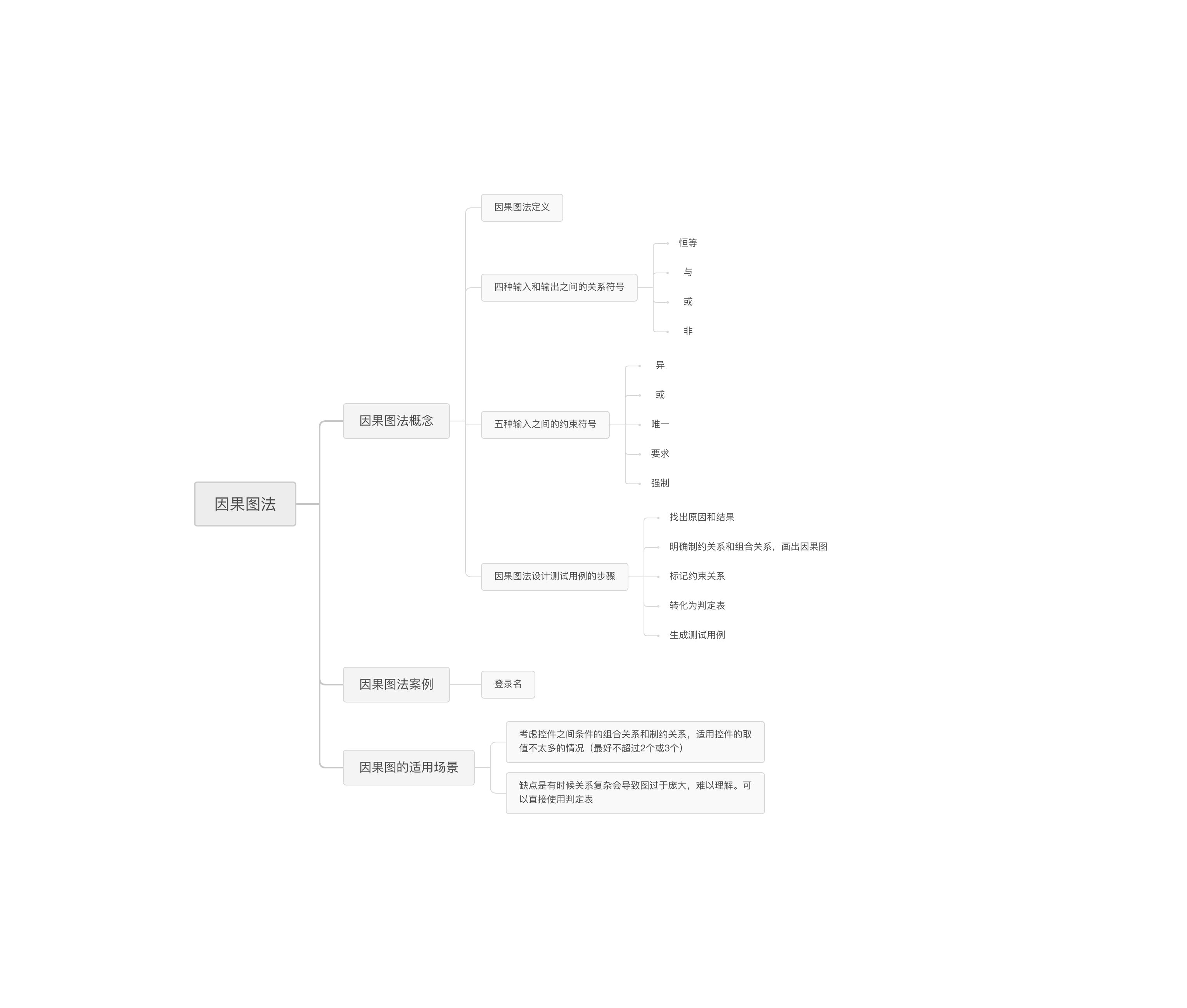 - 第 2 步:明确所有原因和结果之间的制约关系以及组合关系,画出因果图。