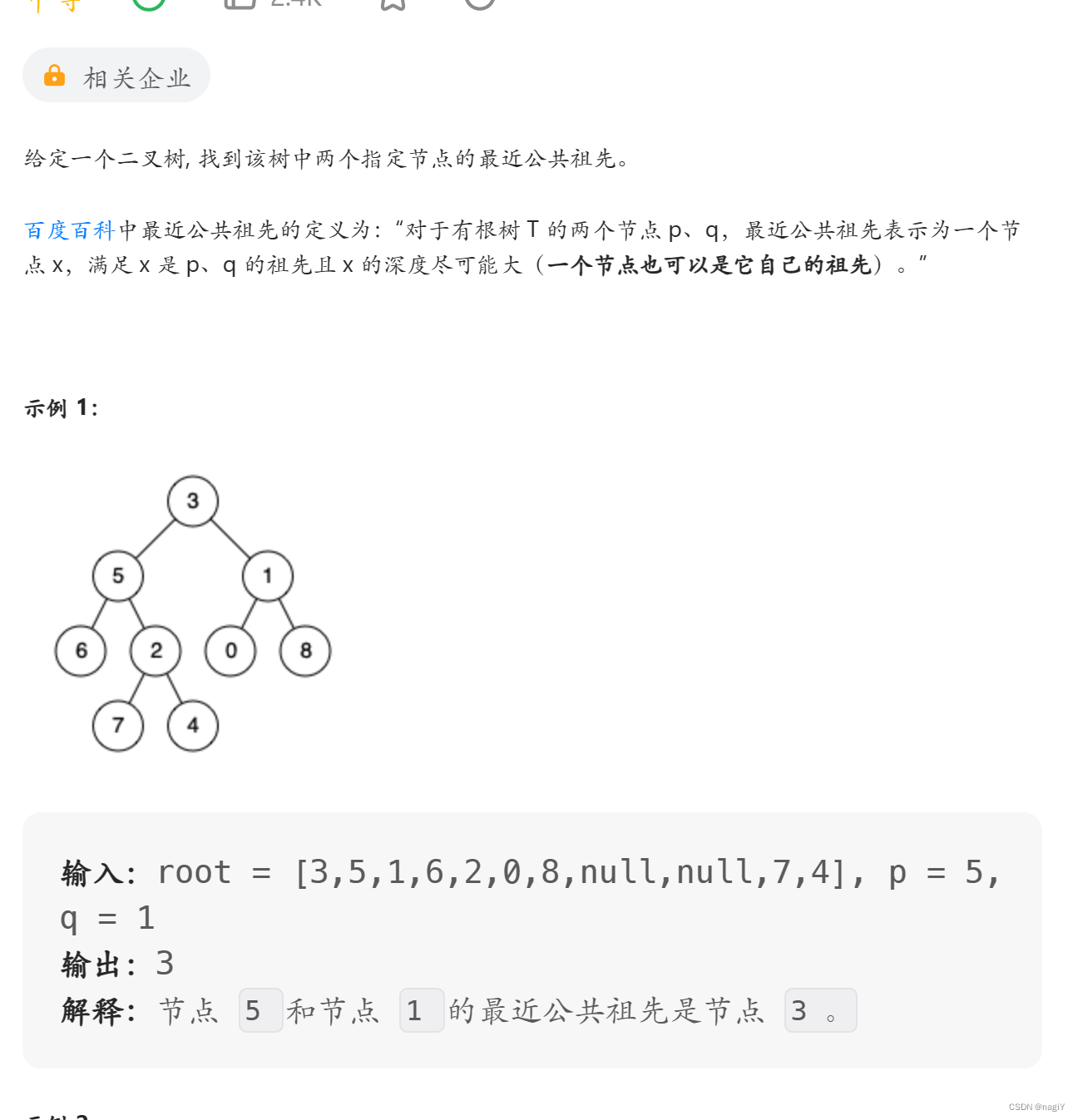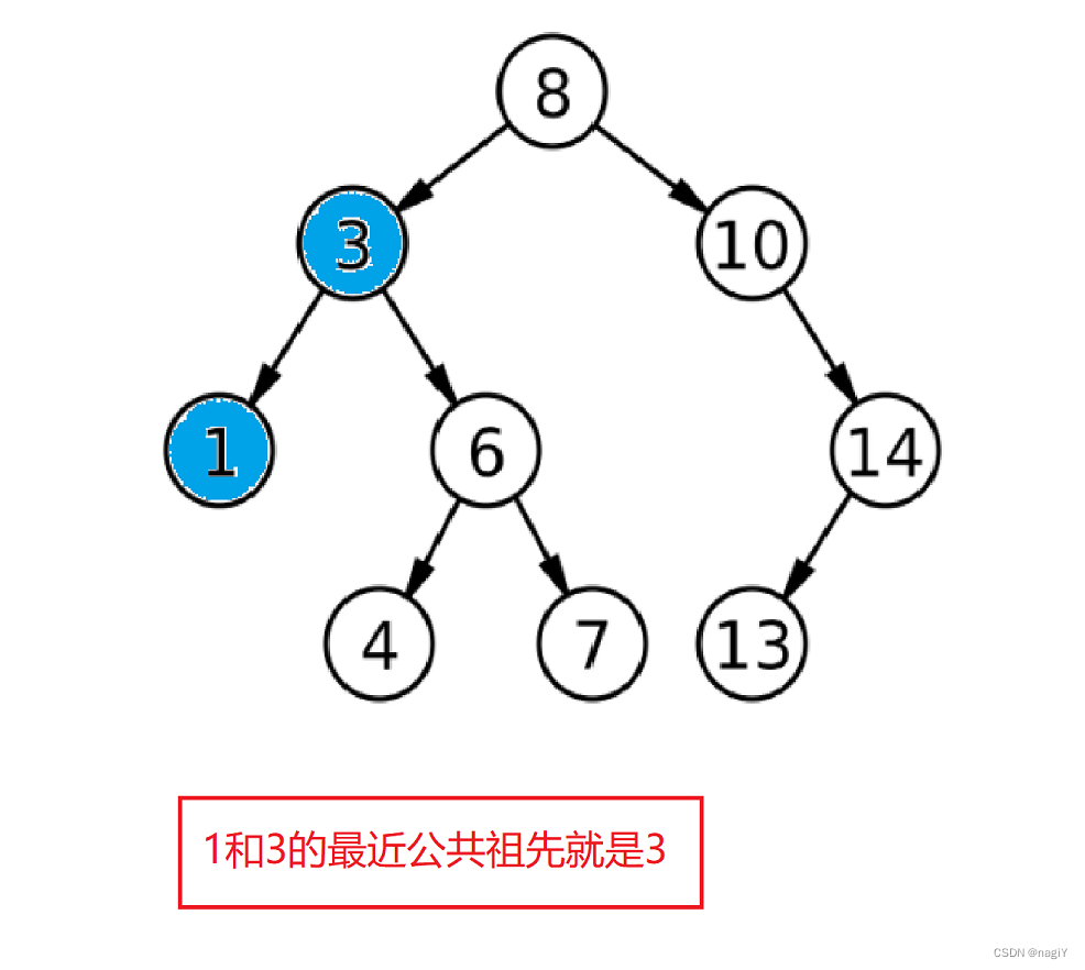 注意,如果有一个节点恰好是根节点,那么这个节点就是最近的公共祖先,也是说一个节点的祖先也算它自己。