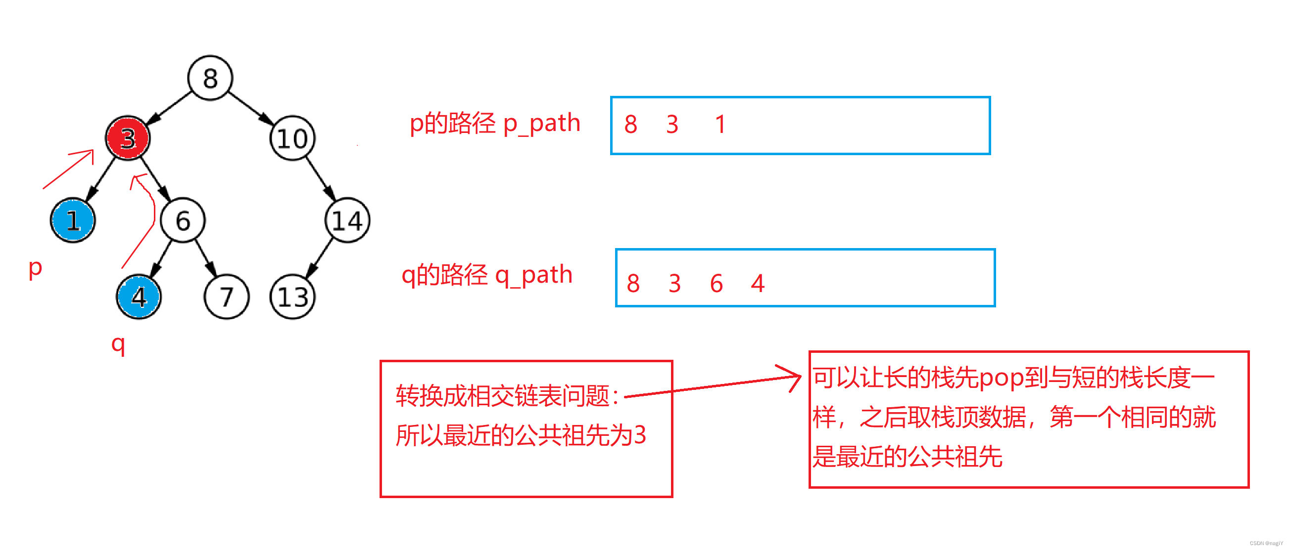 我们可以把要找的两个节点的路径找出来,然后存到栈里,这样把两个节点的祖先路径找出来后,就可以转换成链表相交问题了。