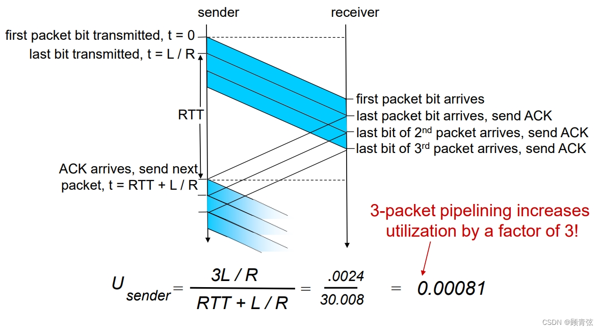 流水线:发送方允许多个“正在传输中”但尚未被确认的数据包(目前还没有ACK的数据包)