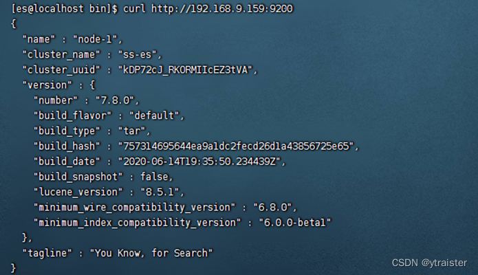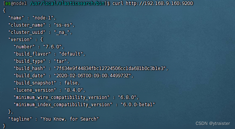 》终端访问 节点IP:9200,显示如图内容,即为ES运行成功