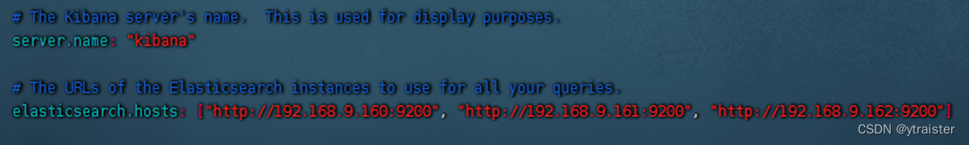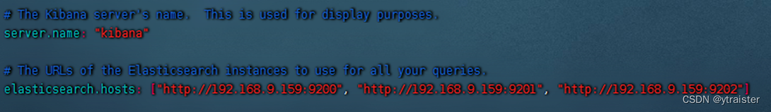修改kibana中的kibana.yml文件vim /usr/local/kibana/config/kibana.yml(只需修改elasticsearch.hosts节点的值即可)