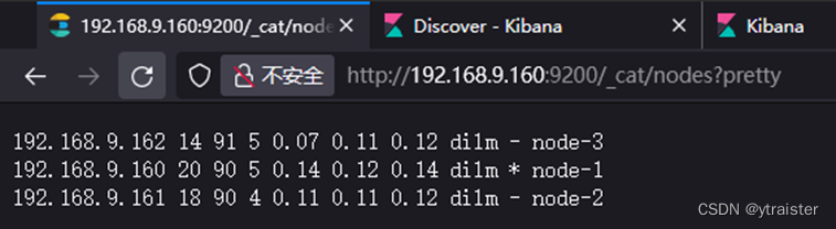 》页面访问 节点IP:9200/_cat/nodes?pretty,页面内容如图即为ES集群运行成功