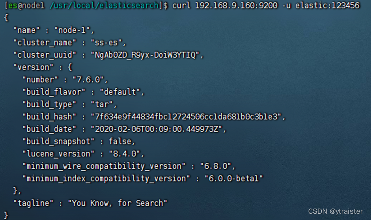 curl 192.168.9.160:9200 -u elastic:密码 # elastic是默认用户名