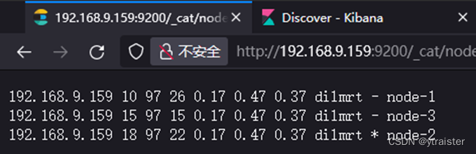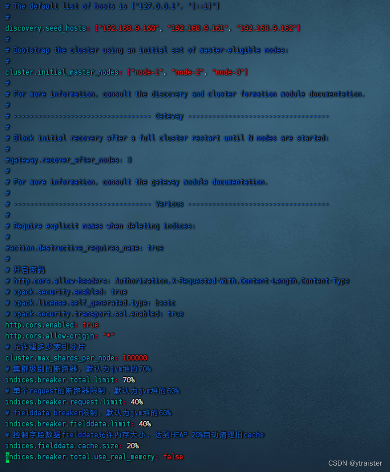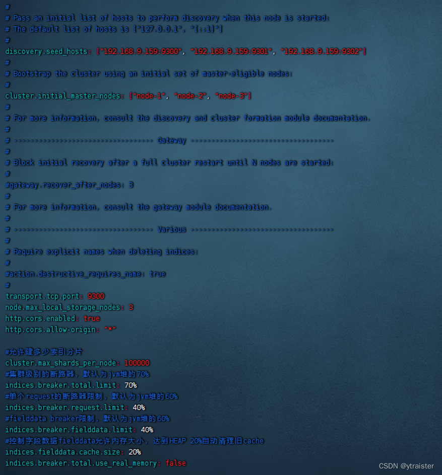 discovery.seed_hosts: ["192.168.9.159:9300", "192.168.9.159:9301", "192.168.9.159:9302"] # 集群中节点IP