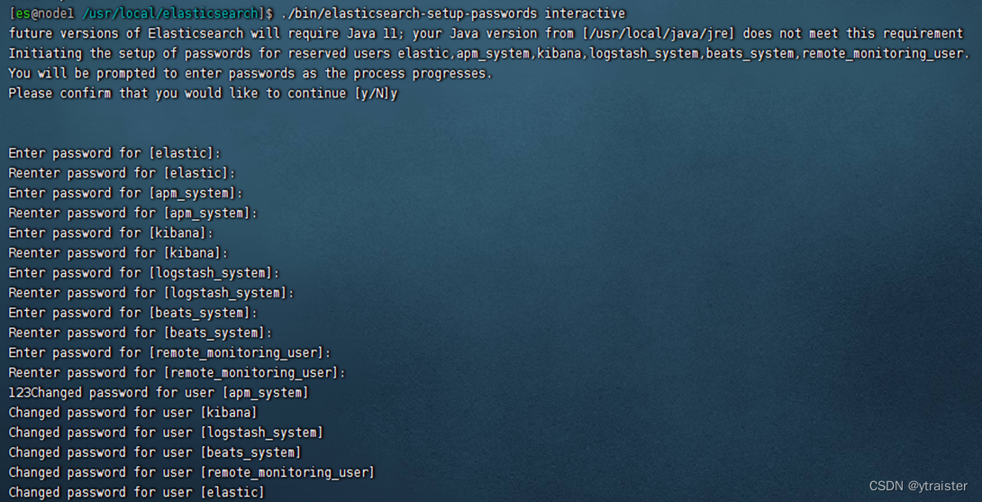 在其中一台es服务器上,配置初始化密码(第一次输入y确认,再依次输入密码即可)
