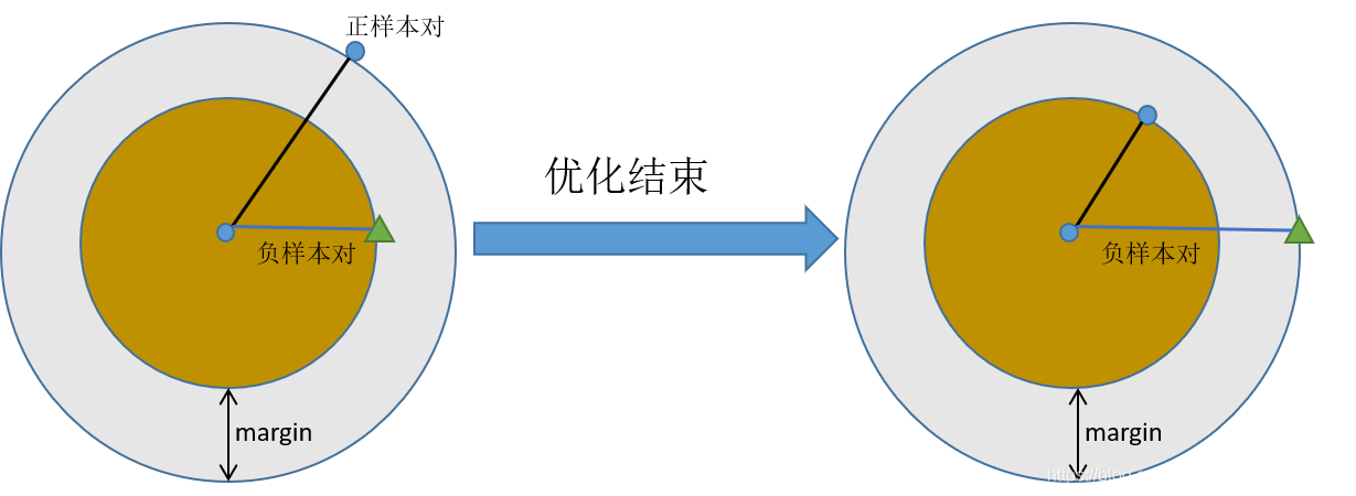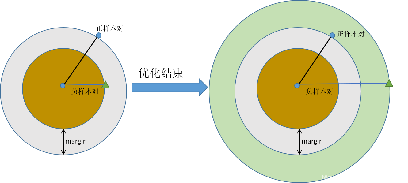 - 其中: margin \text { margin } margin 是根据实际需求设置的训练阈值参数, d a , p , d a , n d_{a, p},d_{a, n} da,p,da,n 代表两个样本对应的特征的欧氏距离。