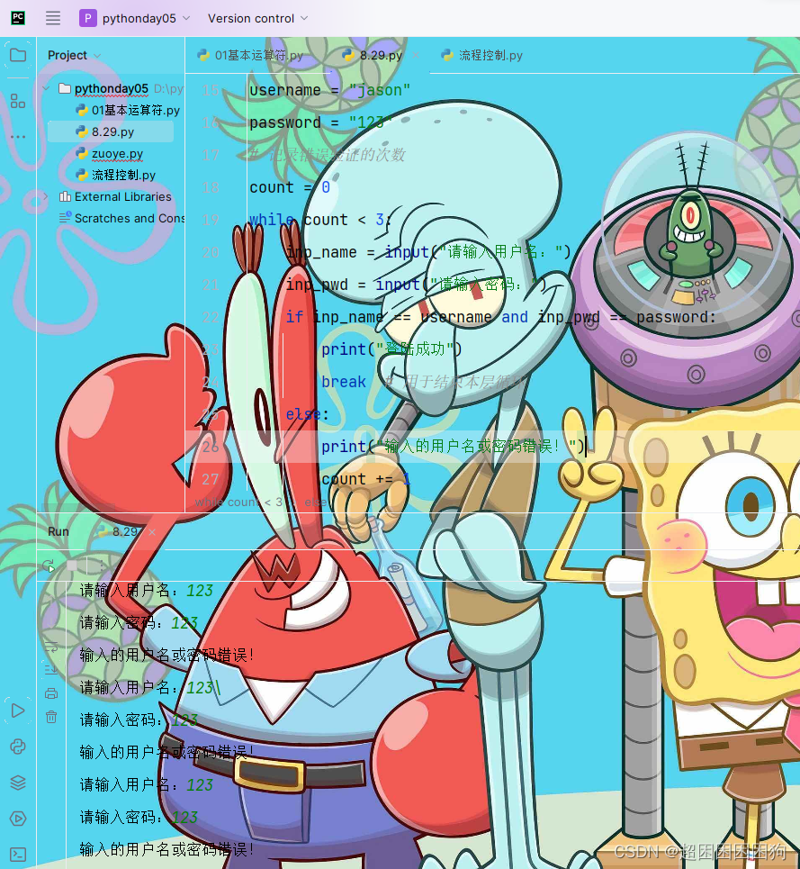 要求:用户名和密码都输入正确,打印来宾三位,否则:提示用户名或者密码错误