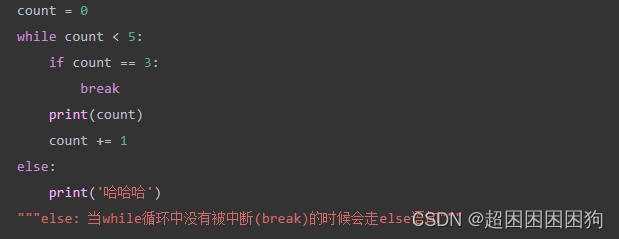 当while 循环正常执行完并且中间没有被break 中止的话,就会执行else后面的语句,所以我们可以用else来验证,循环是否正常结束。