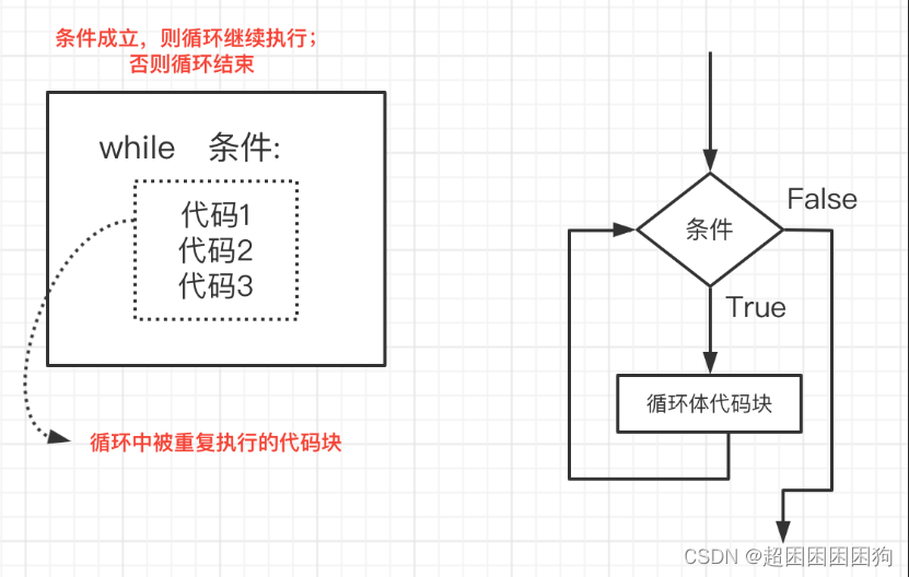 #步骤2:执行完毕后再次判断条件,如果条件为True则再次执行:代码1、代码2、代码3、......,如果条件为False,则循环终止。