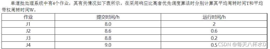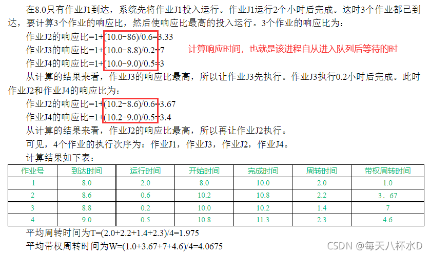 优点:即考虑了作业的等待时间,又考虑了作业的运行时间;即照顾了短作业,又不会致使长作业的等待时间过长。