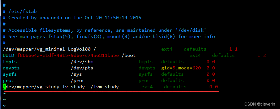 本文需将逻辑卷lv_study挂载到 /lvm_study ,文件系统为ext4 格式,不进行dump备份以及开机磁盘检查。