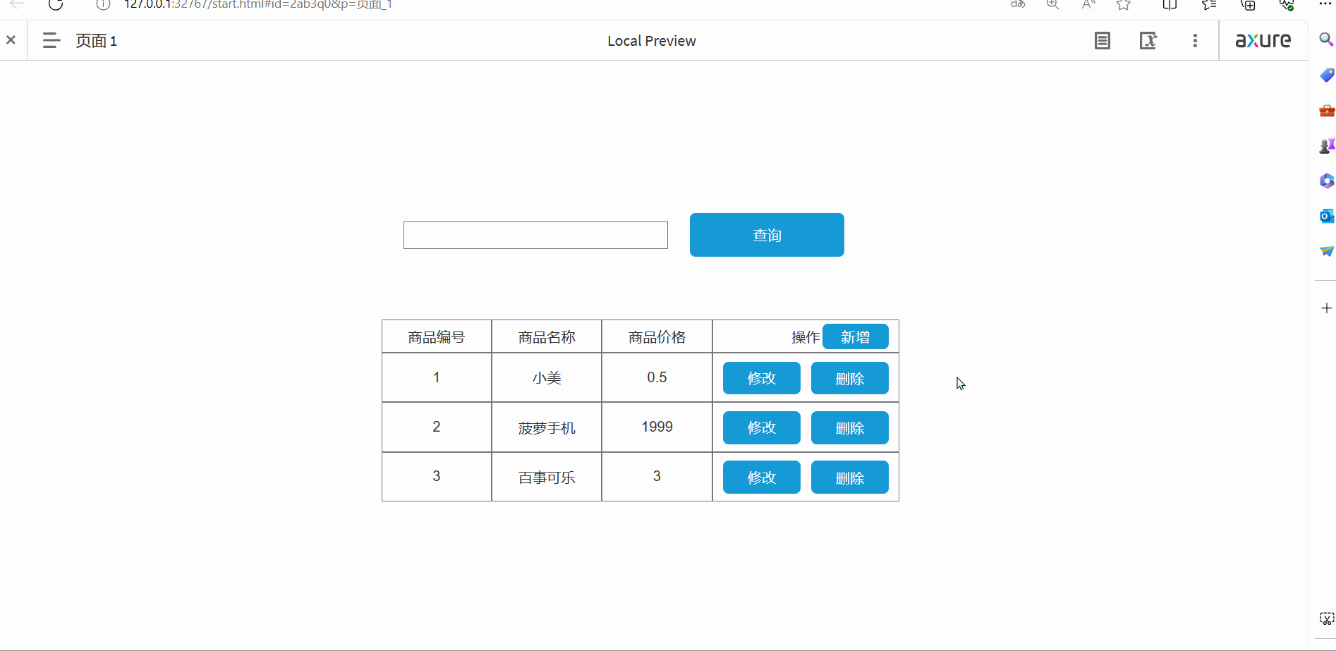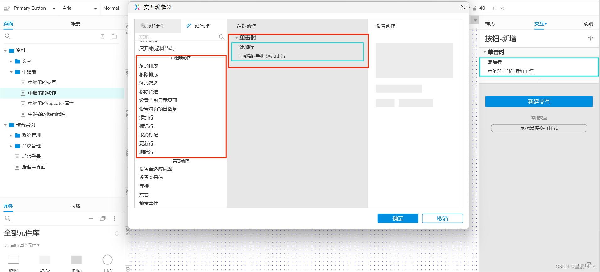 拿新增举例,我们首先得为新增按钮设置一个单击时的交互事件,然后设置一个添加行的动作,拿到各文本框的值,添加到中继器表格各列的值里。