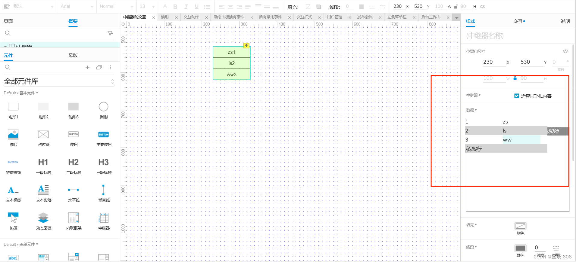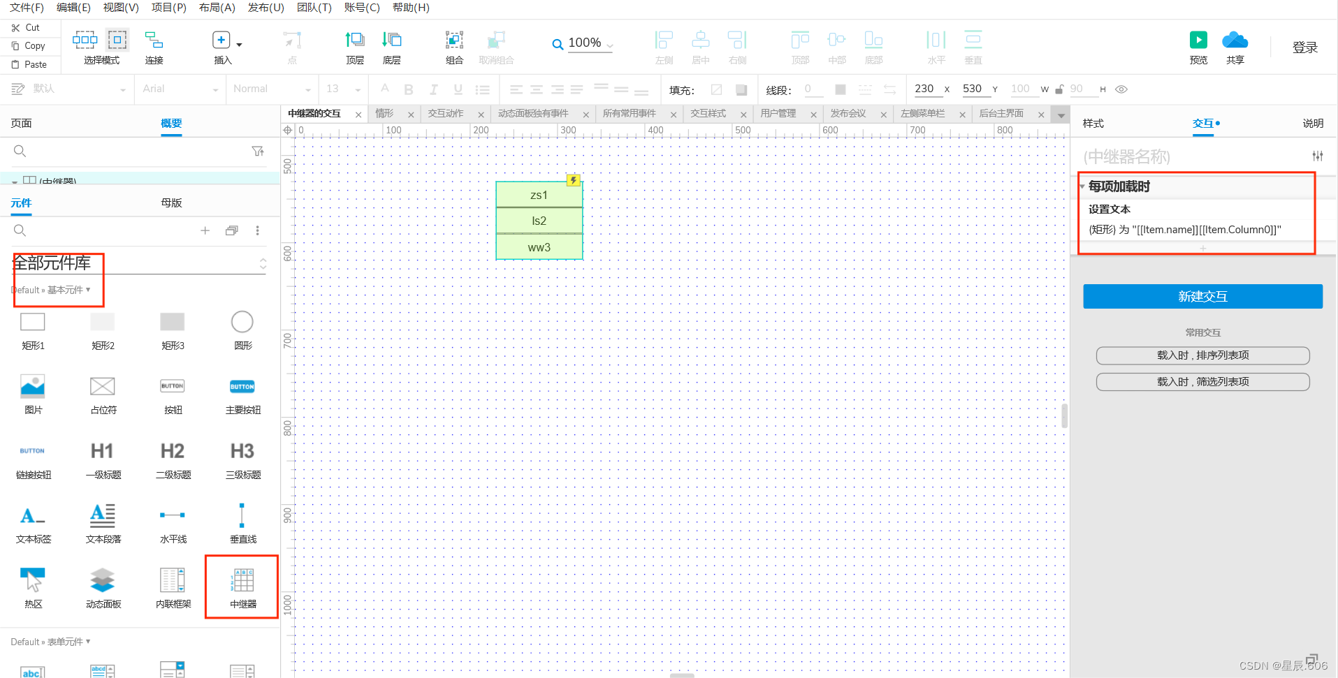 我们先在基本元件库里找到中继器,将它拖到画布上后,为其设置交互事件:每项加载时。