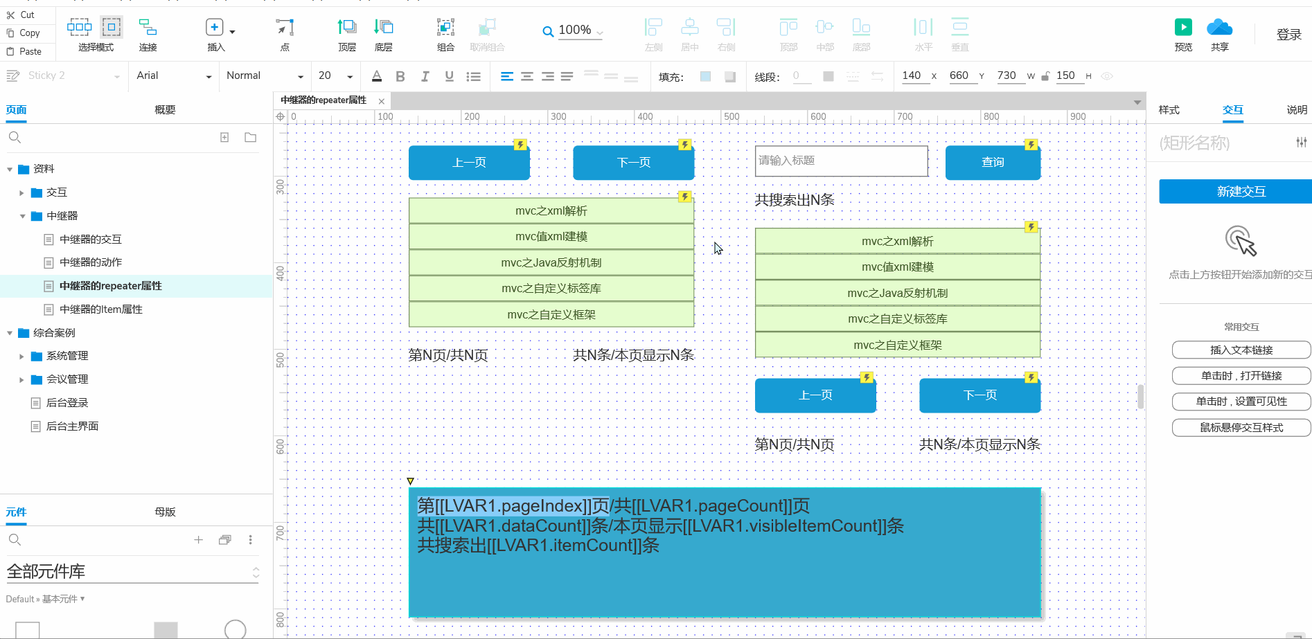 一.概述Axure 中继器是一种特殊的组件,用于在多个页面或组件中共享数据和状态。中继器可以看作是一个数据存储库,可以在不同的页面或组件中传递数据,实现数据的共享和同步。在 Axure 中使用中继器,需要先创建中继器组件,然后在需要使用中继器的页面或组件中引用该中继器。在引用中继器的组件中,可以使用“设置中继器值”命令来设置中继器的值,并使用“获取中继器值”命令来获取中继器的值,从而实现数据的共享
